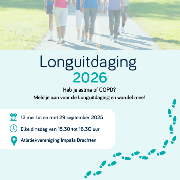 Heeft u astma of COPD en wilt u op een laagdrempelige manier werken aan uw gezondheid? Meld u dan aan voor de Longuitdaging 2026! Onder begeleiding van zorgprofessionals wandelt u 20 weken lang in een veilige en gezellige omgeving.
