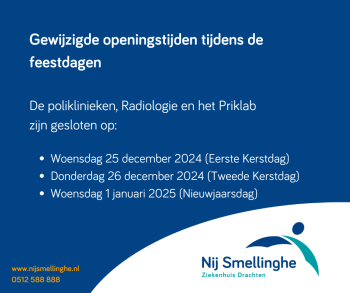 De poliklinieken, Radiologie, Priklab en de Huid- en laserkliniek zijn gesloten tijdens de feestdagen.