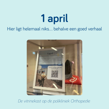 Het is vandaag natuurlijk 1 april! Diegene die al vol spanning naar de polikliniek Orthopedie waren gelopen hebben het waarschijnlijk al gezien. In de vitrine lag namelijk helemaal niks. Geen bijzondere vondst, geen opzienbarende ontdekking, alleen een flinke schep fantasie.