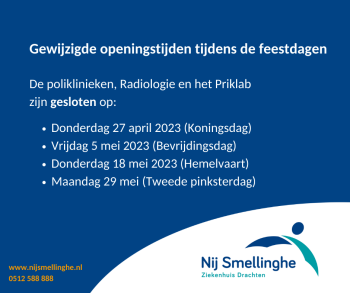 De poliklinieken, afdeling Radiologie en het Priklab (Afnamelaboratorium) zijn gesloten tijdens de feestdagen.