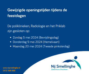 De poliklinieken, afdeling Radiologie en het Priklab (Afnamelaboratorium) zijn gesloten tijdens de feestdagen.