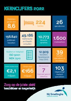 Ziekenhuis Nij Smellinghe sluit 2022 af met een positief resultaat van € 2,1 miljoen (2021 € 1,7 miljoen). Dit positieve resultaat, 1,3 % van de omzet, wordt toegevoegd aan het eigen vermogen en is nodig om de goede financiële positie te behouden. Om gezond en vitaal te blijven, investeren we in onze mensen, diverse duurzame (technologische) ontwikkelingen en samenwerkingsverbanden. Zoals het Lange Termijn Huisvesting Plan, samenwerking met ZuidOostZorg en ROC Friese Poort, ICT, goed opgeleide en duurzaam inzetbare mensen en het versterken van de acute as met onder andere een spoedplein. Zo werken we samen aan duurzame zorg en houden zorg beschikbaar en toegankelijk.