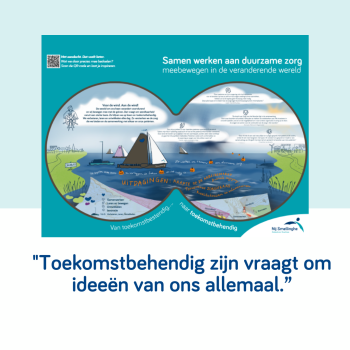 De zorg verandert razendsnel en Nij Smellinghe beweegt mee. Met een wendbare koers blijft ons ziekenhuis hoogwaardige zorg bieden én deze toegankelijk, beschikbaar en betaalbaar houden. Om de strategie helder uit te leggen, is een praatplaat ontwikkeld. Hiermee nemen we medewerkers en andere betrokkenen mee in de plannen. Want duurzame zorg realiseren we samen door mee te bewegen. Iedereen in en rondom het ziekenhuis wordt daarom gevraagd én uitgedaagd mee te denken.