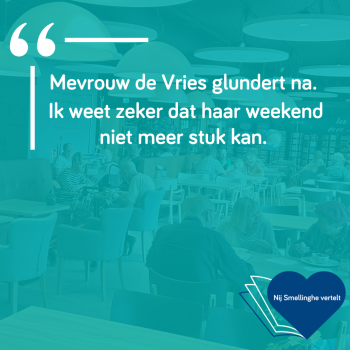 “Het is vrijdag lunchtijd. Ik werk nu drie weken in Nij Smellinghe en ik zit samen met mijn collega Sarah te lunchen in ons restaurant. Het is druk en alle tafels zijn bezet. We zien een man met een oudere dame rondkijken voor een tafeltje. Wij wenken ze en zij nemen plaats aan onze tafel. Het zijn een moeder en haar zoon. De moeder zit in een rolstoel en mist een deel van haar onderbeen. We maken een kort praatje en wensen elkaar eet smakelijk.